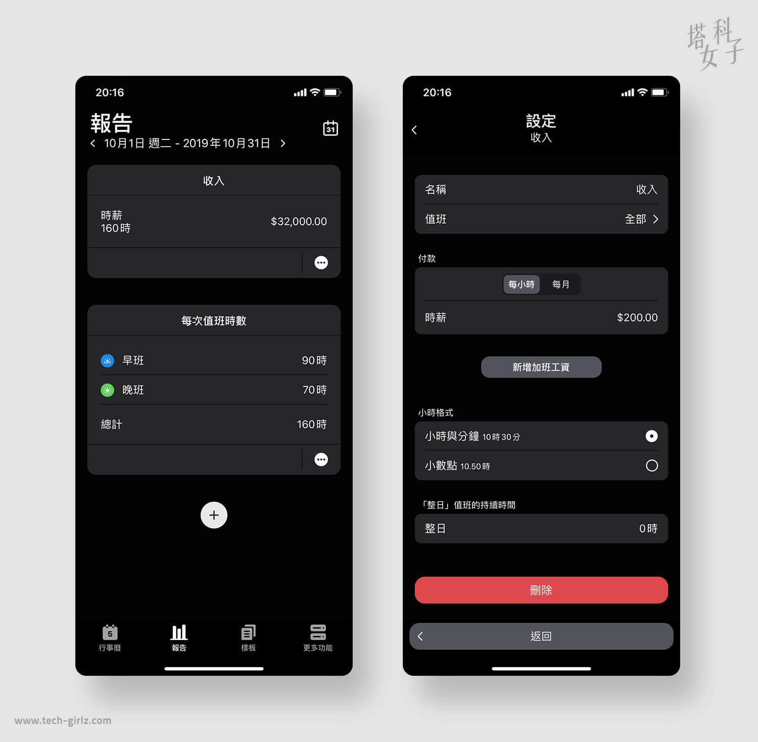 而在報告這個分頁裡,除了直接幫你算出值班時數之外,還能依據你每個月的班表情況替你算出工時;如果你還想算出當月薪水,在收入的欄位中,點選「⋯」可以進一步設定薪資細節,例如時薪或月薪以及加班工資。