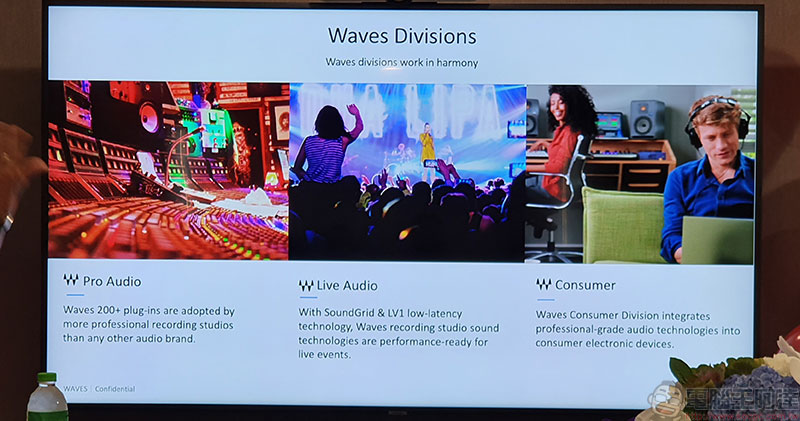 目前 Waves 主要分為三個部門,分別為最早成立專司提供音樂產業服務的專業部門,將專業錄音室混音功能等以最低限度器材帶到現場表演的現場部門,以及 10 年前開使將專業等級音訊解決方案普及,讓每個人都能在筆電與手機上享有專業音效的消費者部門。