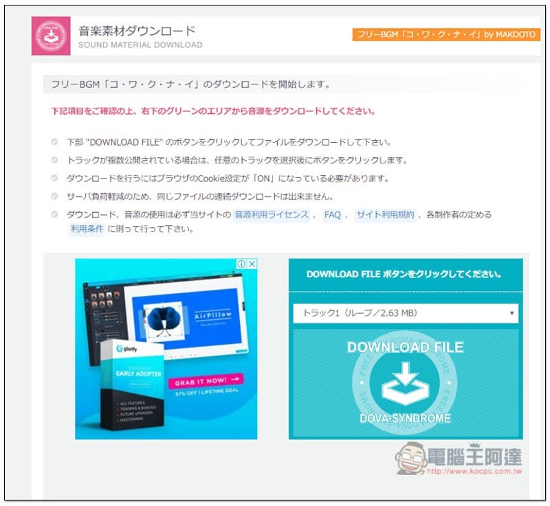 頁面往下滑,會看到一個音樂素材xxxxxx 的功能,點選之後即可進到下載頁面: