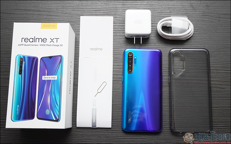 話不多說,直接攤開 realme XT 盒裝所有內容物,除 realme XT 手機本體外,提供保護殼、 20W VOOC 3.0 閃充充電器、 USB Type-C 傳輸線、說明文件和退卡針: