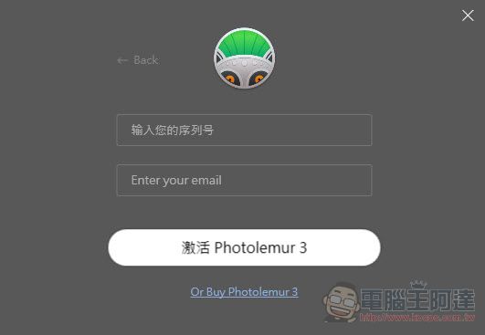 「 Photolemur 3 」支援中文,首次使用需先點選第一列用序號註冊,接著輸入剛剛獲得的序號及填寫的信箱再點”激活Photolemur “即可: