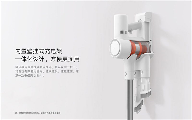 除此之外,米家無線手持吸塵器1C 也配備壁掛式充電架,只要將電線安裝在充電架內,平時為使用時就能將吸塵器掛在充電架充電,同時也有效避免過去吸塵器佔空間的問題: