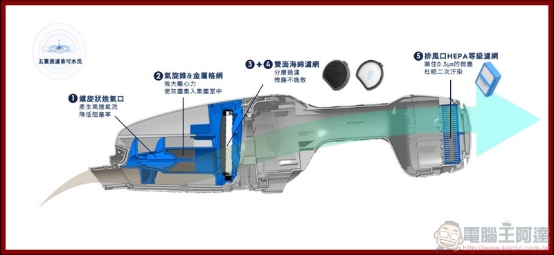 可以看到下方的PURE Q9最重要的核心吸塵部分,HEPA級五重高效過濾系統 有效阻隔二次污染,不會讓灰塵跑的到處都是,再最後的排風口孔部分,還設有了HEPA等級濾網,0.3-10 µm細塵都不會放過: