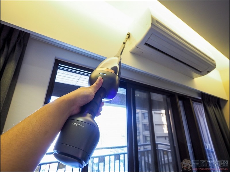 PURE Q9 內建2100mAh鋰電池,全程使用超過 60 分鐘也完全沒問題。將家裡角落全部清掃過一遍,像這種很難清理的冷氣上方,拿起長刷頭+小型PURE Q9根本小菜一碟: