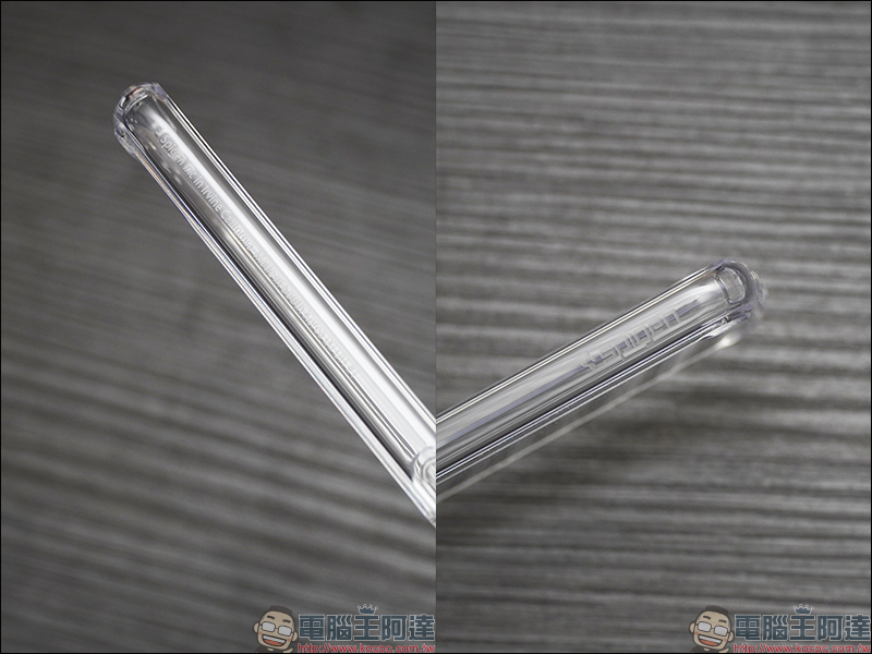 第一眼看到 Spigen Ultra Hybrid 保護殼的確會令人被它的質感感給驚豔,因為市面上推出透明保護殼的款式相當多,但要能呈現如此純淨的質感實屬難得。 Ultra Hybrid 材質採用硬質 PC 背蓋,讓機身背面能防止刮傷: