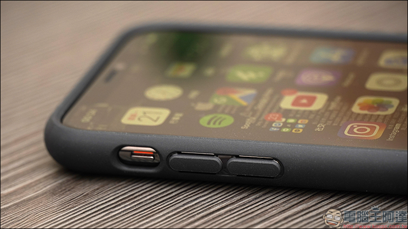 機身側邊靜音鍵的開孔設計也很完美,音量鍵則採用與邊框相同的 TPU 材質包覆,且音量鍵內側中心有加強處理,讓按壓時更省力、回饋感也更好: