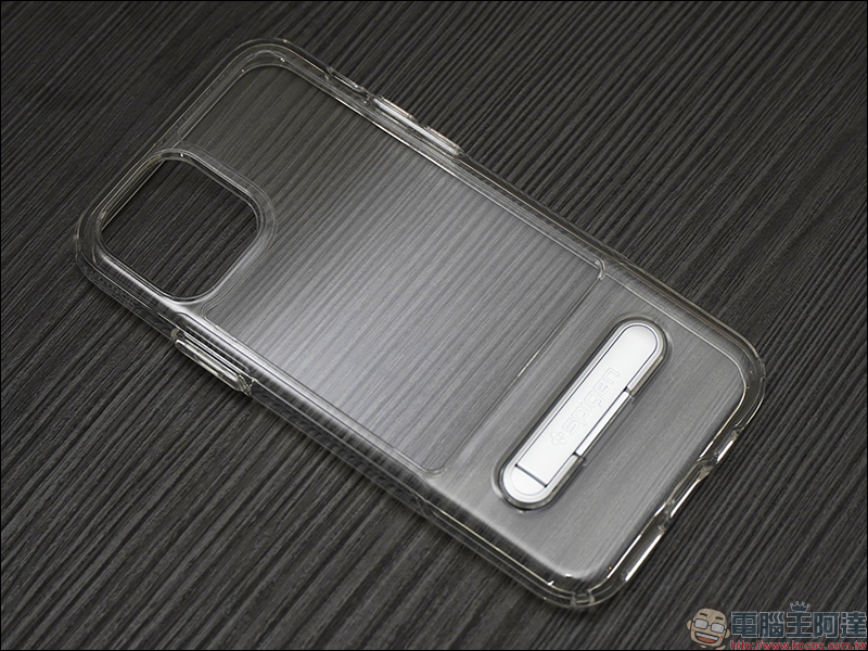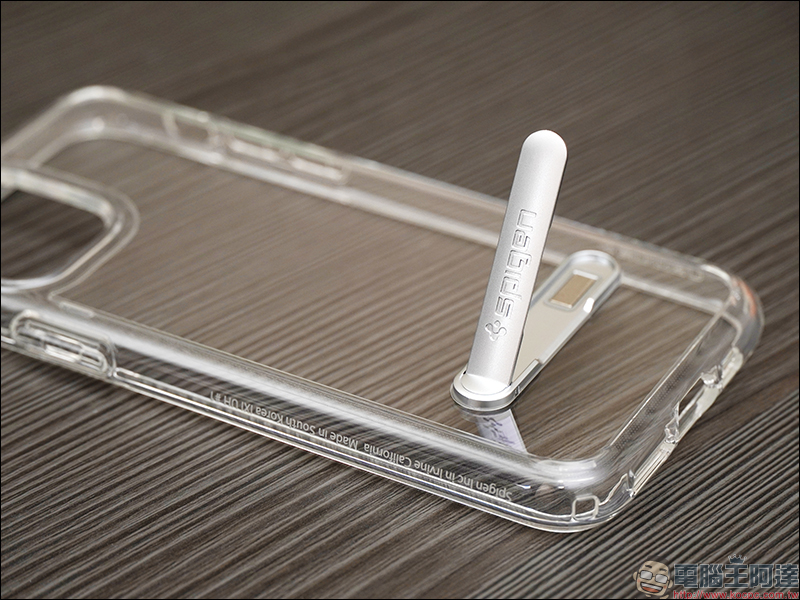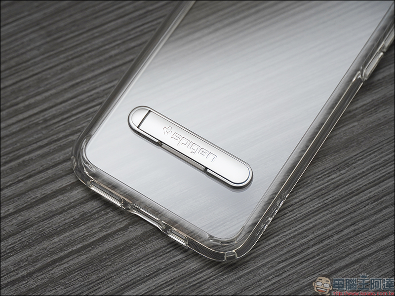 Slim Armor Essential S 的支架功能也相當穩固, Spigen 的品牌 Logo 也設計在支架表面: