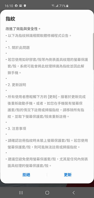 在更新中,Samsung 也說明了之所以造成非註冊手指也能登入的問題,主要因為矽膠保護殼套的內側,或是螢幕保護貼上所存在的細小紋路會使得指紋辨識器誤判為指紋,所以 Samsung 建議大家避免在螢幕上安裝保護貼。而在註冊登錄指紋時,也應在移除保貼後進行,才不會產生指紋與保貼上紋路交叉干擾,造成準確度下降。