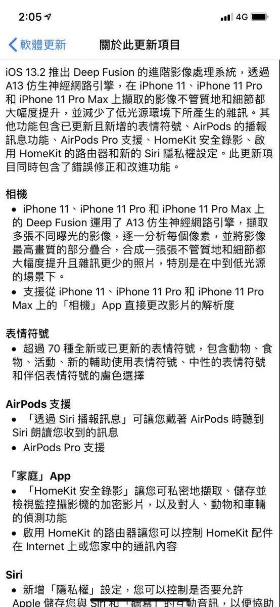 正式開放更新的ios13.2為568.4MB,本次更新包含Deep Fusion進階影像處理系統,與Siri新增隱私權設定等不少值得留意之處,相關重點更新內容如下: