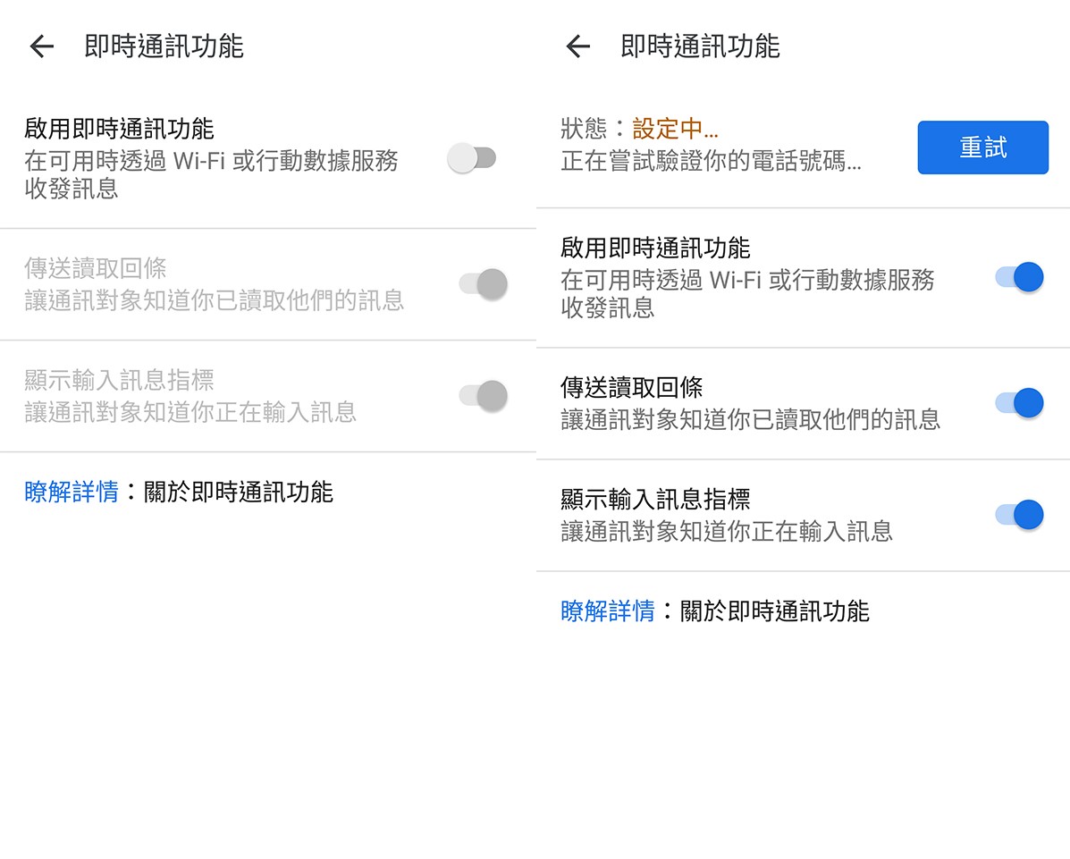 再來開啟「訊息」App,從右上方的三個點進入「設定」,選最上方的「即時通訊功能」,再點上方的「啟用即時通訊功能」,上面會出現一個「設定」或「重設」,點「設定」或「重設」進去後輸入電話號碼,讓 Google 驗證。我們測試的時候,驗證的時間長短非常不一定,有時一次就通過,有時要重複設定跟驗證才能通過。驗證完成時,設定中會改顯示為「已連上網路」。