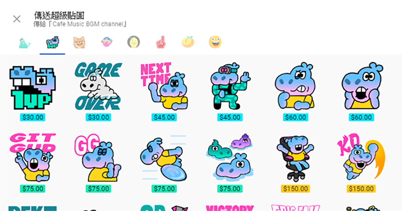 根據 YouTube 的說法,超級貼圖可以在「單擊按鈕」時啟用,如果你之前已打開超級聊天功能則已經預設啟用。最終觀眾可以通過點擊即時聊天介面表情符號按鈕旁邊的「表達你的支持」按鈕,然後在超級貼圖項目中輕鬆發送貼紙。你可以從八種貼紙包中選擇想要發送超級貼紙,每個系列的每張貼紙在價格上都有差異,要小心選用。