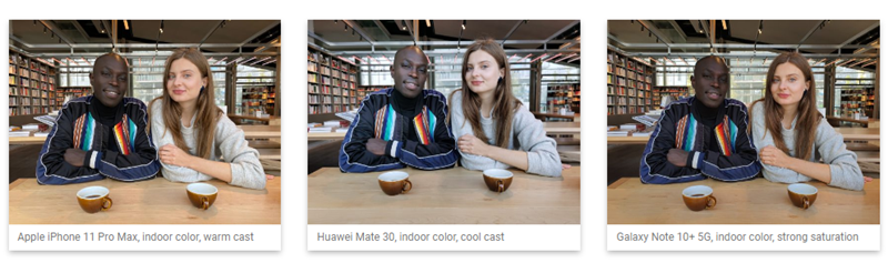 顏色方面 iPhone 11 Pro Max 與 Galaxy Note 10+ 5G 都偏暖,Mate 30 則偏冷: