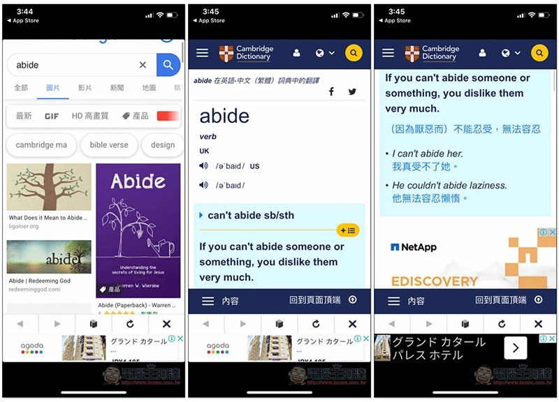 也提供直接圖片搜尋、查詢 Cambridge Dictionary 解釋的功能,這我還蠻喜歡的,非常方便,可快速加強對單字的聯想力,也能獲得更多單字例句與解釋:
