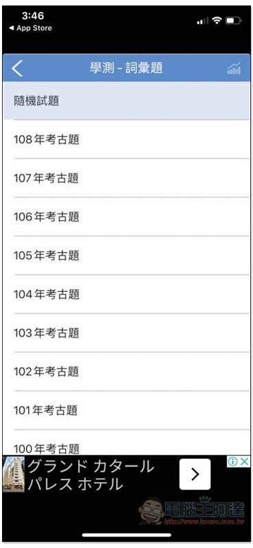 考古題部分也相當豐富,收錄的有學測、指考、統測、二技、國中會考以及高普考,下方可以切換: