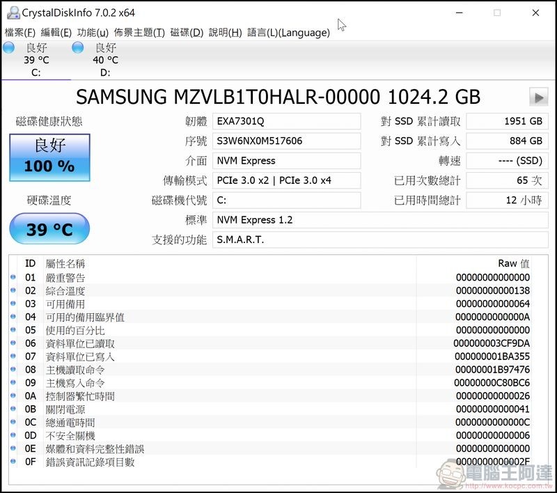 內建的 SSD 使用三星 PM981 M.2 PCI-E NVMe 1TB SSD(SAMSUNG MZVLB1T0HALR),最高讀寫速度為 3200MB/s讀、2400MB/s寫入,規格上也給的有相當誠意:
