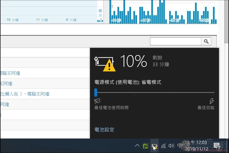 接著阿達以開啟Google 流量分析頁面,實際模擬持續上網與使用雲端服務的情境續航表現(設定最佳電池時間,螢幕解析度 4K、亮度 50%),由 100%到 10%約使用七小時預估至少有7.5小時續航表現: