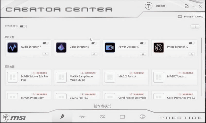 內建軟體的話 MSI 為 MSI Prestige 15 設計了一個創作者中心(Creator Center),裡面共有五個選項,第一頁「創作者模式」內建了不少創作者會需要的應用,如威力導演17試用版、Adobe系列(需自行購買)的快捷鍵: