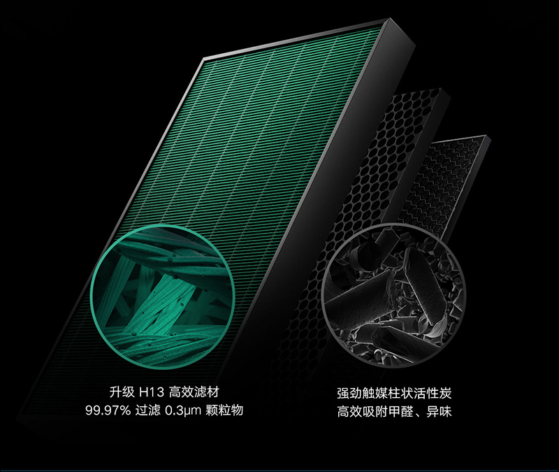 米家空氣淨化器MAX 增強版採用升級 H13 高效級 HEPA 濾濾材,能過濾 99.97% 小至 0.3μm 的顆粒物。搭配雙層活性碳過濾層,能有效吸附甲醛、甲苯等有害氣體和異味: