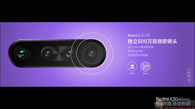 接著是另一端的獨立微距鏡頭,可拍攝 2cm~10cm 的超微距畫面,也支援自動對焦、微距影片拍攝。這也是 Redmi K30 系列 5G 4G 唯一的差異,前者採用 500 萬像素,後者則採用 200 萬像素: