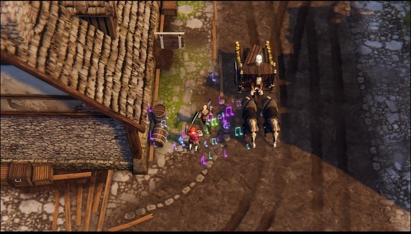 談過了任務,接下來就是音樂了。在 GTA 遊戲中有項傳統一直被保留到現在,就是電台的存在。GTA 系列遊戲內容幾乎都圍繞在車輛上,車上的收音機自然是遊戲重要的配樂來源。在 Rustler 中,雖然中世紀背景不適合「變」出收音機邊騎馬邊聽,但玩家可以透過雇用吟遊詩人的方式,聽這些人邊跑在你身旁邊唱歌: