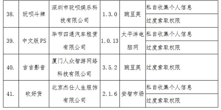 中華人民共和國工業與信息化部公布的 41 款涵蓋類型非常廣,有影音、新聞、運動、金融等等,而涉及的侵權內容大多都是私自收集個人訊息、分享給第三方、或是要求過多權限。另外從這份公告著名的第一批名稱來看,似乎名單還不只這些,後續還有更多。
