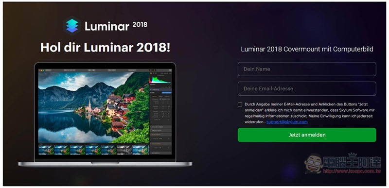 這次 Luminar 2018 的限免優惠活動頁面非常隱密,進到官網是找不到的,點我跳轉之後,Name 填入你的名字以及 E-Mail,打勾下方的框框,序號跟載點都會寄到這個信箱,所以記得填你有在用的: