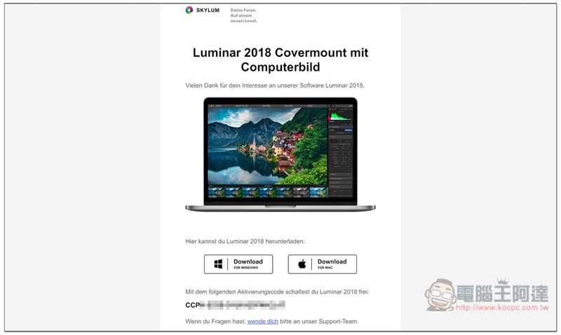就會收到這封信,裡面會有 Windows、Mac 安裝檔的載點、軟體序號: