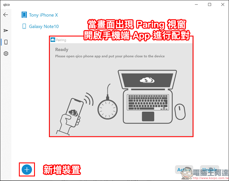 接著點選畫面下方的「+」按鈕新增裝置,當畫面出現「Paring」視窗,前往手機端開啟 qico App 進行配對:
