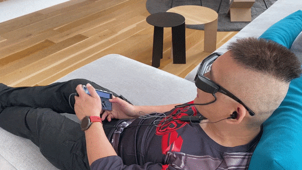 搭配有線耳機使用大概就是這樣,大家應該會說這樣看久了會不會傷眼,根據官方的說法 BT-30C 的反射透視原理,對於眼睛的負擔比較小,對於視力影響小於電視與手機(但建議看一段時間還是要休息一下啦):