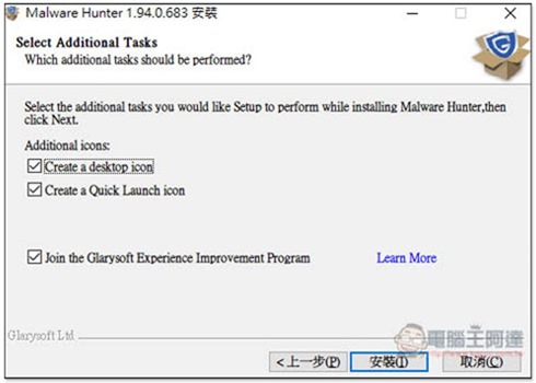 唯獨這畫面有一個選項你可能不會想要,「Join the Glarysoft Experience Improvement Program(加入 Glayrysoft 的改善計畫,會把你的使用報告自動傳送給他們)」,預設打勾,不想可以取消: