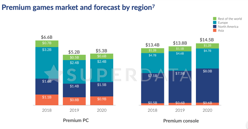 儘管免費遊戲收入增長,但大作類的遊戲收入下降了 5%。銷量最高的 PC 和家用主機 3A 遊戲是 FIFA 19 這款每年固定發行的體育類遊戲,決戰時刻:現代戰爭、GTA V 和 FIFA 20 則分列第 2 至 第 4 名。說,這種停滯主要是由於缺乏主要的遊戲發行。 首席分析師 Carter Rogers 表示,這是由於在 2019 年 3A 大作的發行較緩的原因。 2020 上半年的各種大作發表,將會是大型遊戲有史以來最吃重的一年,2020 年的收入預估將達到 198 億美元。備受期待的遊戲,例如 Cyberpunk 2077、The Last of Us Part II 和Animal Crossing: New Horizons (暫譯動物之森:新視野)將會在下一代主機發佈前問世。