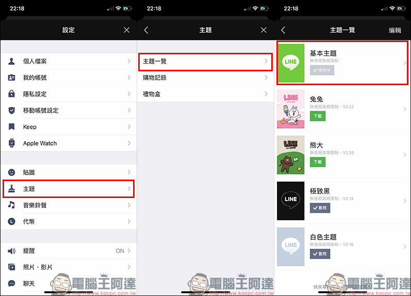 接著在 LINE App 設定的主題選擇「基本主題」,若使用其他主題將無法呈現效果: