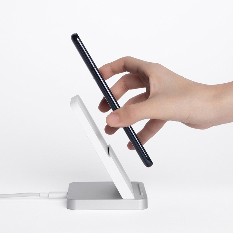 小米立式風冷無線充採用人體工學的傾角設計,能讓用戶一邊充電、一邊檢視手機訊息: