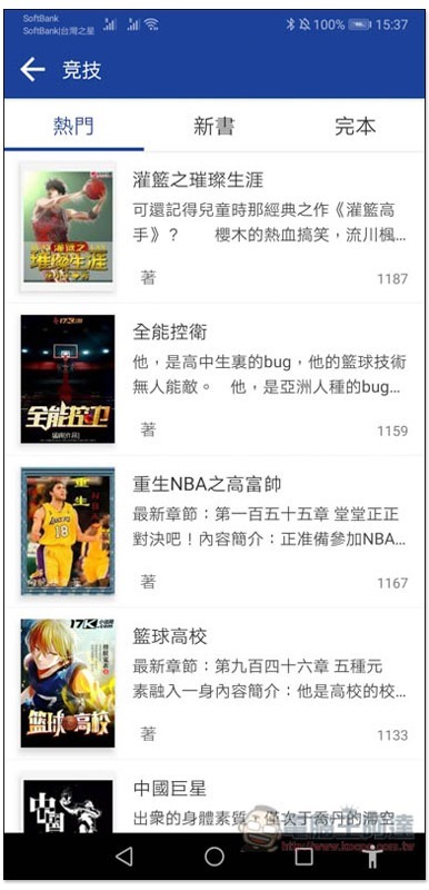 每個分類裡面,也會再細分熱門、新書以及完本(已完結):