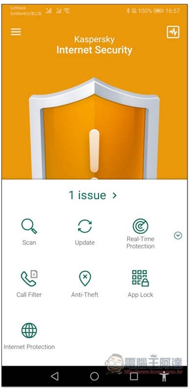 下圖是免費版的畫面,共有 7 大功能,「Scan 掃描」、「Update 更新」、「Real-Time Protection 即時防護」、「Call Filter 電話過濾」、「Anti-Theft 手機遺失防護」、「App Lock 應用程式鎖」與「Internet Protection 網路保護」,有些功能右側有黃色鎖頭圖示,這代表僅限付費版使用,而最重要的即時防護、網路保護都是: