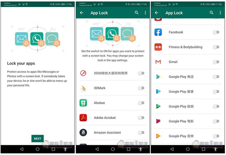 App Lock 應用程式鎖這功能也相當實用,如果你有哪些 Apps 不想被別人打開,就可以透過這功能來建立密碼鎖,全部已安裝的 Apps 都支援,右側開關打開即可: