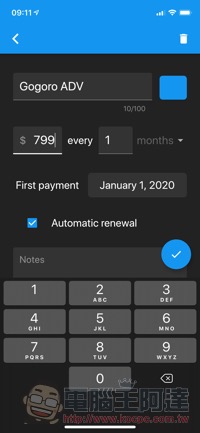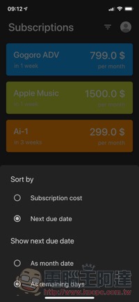 可以設定提前多久通知你,對於想在最後一刻再退訂的朋友很重要。加入多個項目之後則是可以在主頁選擇依費用或更新時間來顯示項目: