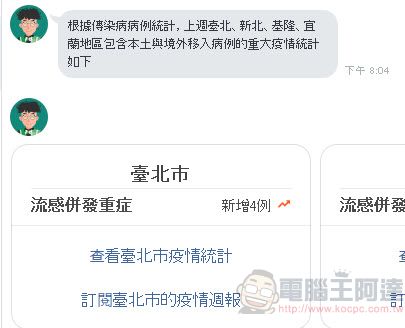 若是點選「了解國內外疫情」,「疾管家」會先詢問想查詢地點所屬的國家名稱(中英雙語皆可),在手機版的Line可快速點選國家名稱,像是國內、中國大陸等,不過目前這部分的資料似乎僅涵蓋一般流行傳染病的統計狀態,若是想確認武漢肺炎的疫情狀態,可能還是先得從「查看防疫快訊」的新聞稿中確認。