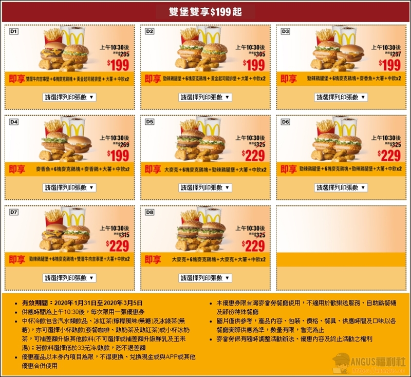 - 本優惠券限於購買套餐(超值全餐、麥當勞分享盒、 Happy Meal、超值早餐、早安套餐)時使用,可同時享有人氣加點優惠;每份套餐每次限用一張優惠券