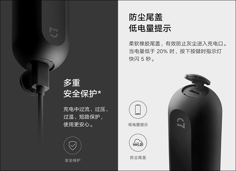 機身底部則為 micro-USB 充電口,在低電量狀態按下按鍵時指示燈會閃爍 5 秒提示電量不足建議用戶充電。充電口也提供防塵蓋設計,能防止長時間使用後灰塵進入充電口。在充電期間的安全性部分,也提供過流、過壓、過溫、短路等多重安全保護,讓使用更安心: