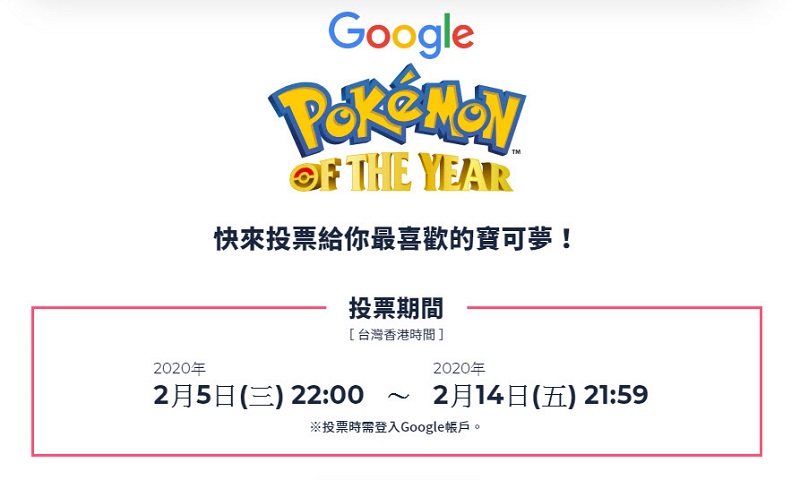 投票時須留意必須使用 Google 帳戶才能投票,每天最多可投票 1 次,1 次最多可投票給 8 隻寶可夢,投票期間中每天皆可投票,投票期間為2020年2月5日(三)22:00-2020年2月14日(五)21:59。