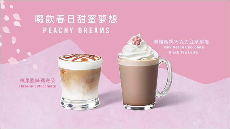 最近台灣星巴克也搭上春天櫻花季,推出「榛果風味瑪奇朵」和「春櫻蜜桃巧克力紅茶那提」兩款期間限定飲料。榛果風味瑪奇朵以綿密香醇的奶泡混合著香甜烤堅果的糖醬滋味,搭配深烘焙的經典義式濃縮咖啡;春櫻蜜桃巧克力紅茶那提則以經典的阿薩姆紅茶做基底,搭配蜜桃果醬與巧克力醬混合成專屬櫻花季節的飲品。