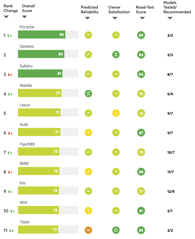 然而,也如同 Tesla 針對 Model 3 煞車問題迅速反應的更新那樣,在逐步提升車輛可靠度後,兩台 Tesla 車款去年底也最終獲得了認可,正式被列回了推薦清單之中。近日《消費者報告》更新了的最新推薦車輛品牌排行,也正式將 Tesla 放在了即將跨進前十名的第 11 名的位置,相對於先前一舉竄升了 8 個位置,而且也依然是唯一一個被列在其中的純電動車品牌。