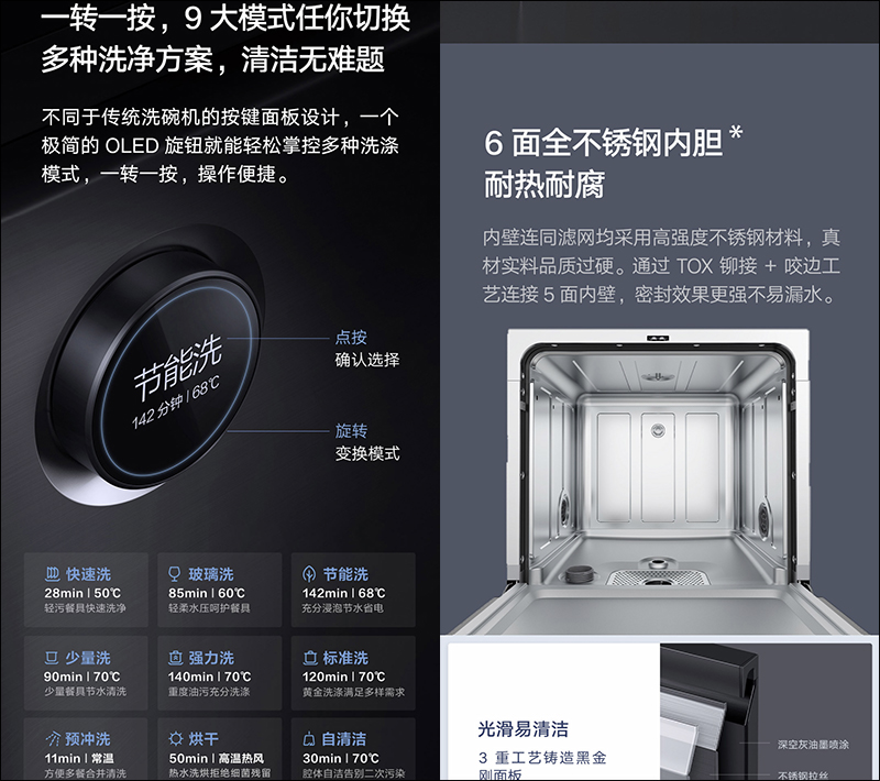 在機身上,米家互聯網洗碗機(8套嵌入式)也配備一個結合 OLED 顯示螢幕的極簡旋鈕,能透過旋轉、按壓操作及檢視洗碗機。洗碗機也支援快速洗、玻璃洗、節能洗、少量洗、強力洗、標準洗、預沖洗、烘乾、自清潔等 9 大模式。機身內壁連同濾網則採用高強度不鏽鋼材質。