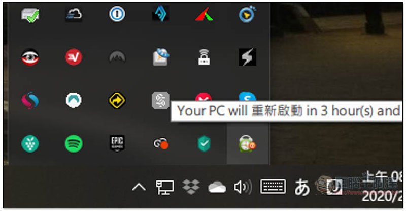 綠色鬧鐘的圖示,滑鼠移過去也會提示多久之後會關機、重新啟動或其他你指定的任務模式: