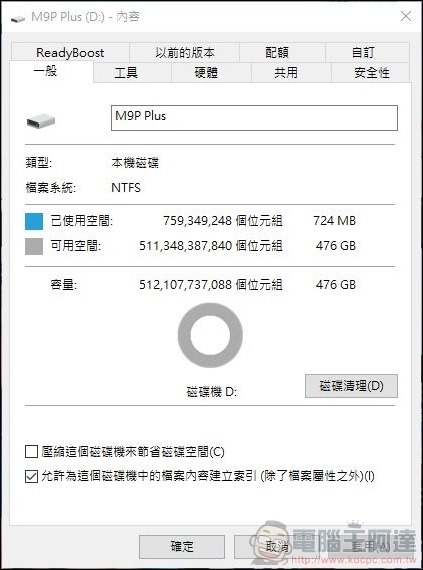 我們在硬碟的資訊上,可以發現 512GB 的容量在換算過後的實際容量為 476GB: