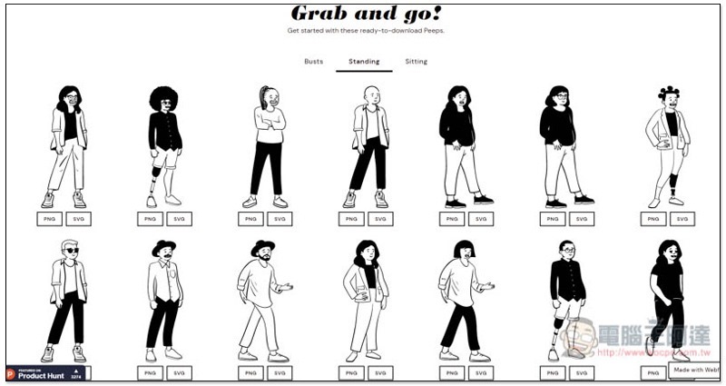 網頁下方可查看所有人物手繪插圖,分成三大類:Bursts、Standing、Sitting,每一張都提供 PNG 與 SVG 檔案格式: