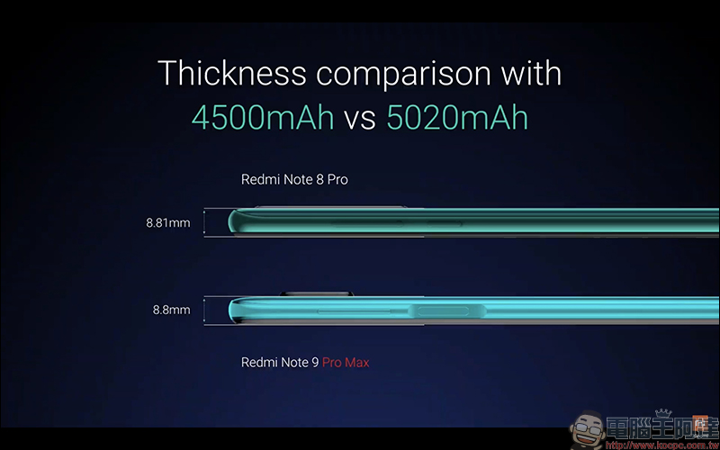 即便電池加大, Redmi Note 9 Pro Max 的機身厚度反而比 Redmi Note 8 Pro 還要薄:
