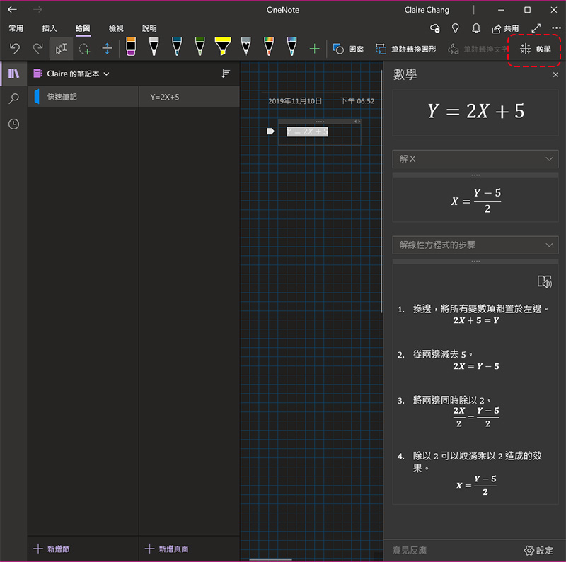 然後點擊最右邊的「數學」,接下來你可以在側欄中選取動作,往下還可以選擇顯示解線性方程式的步驟。