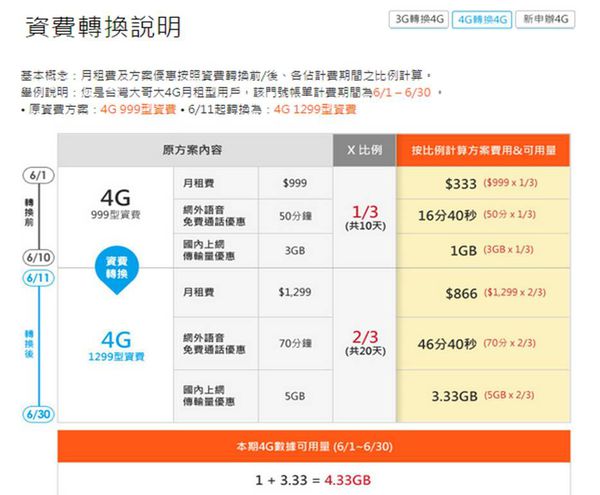 若是中華電信用戶,升級為4G資費後,若語音分鐘數或上網傳輸量不足無法如3G資費向上改用資費(如大省333改成大省430),必須另外付費購買語音分鐘數或傳輸量,資費變更的自由度會大打折扣。若本身通話需求或上網量較大,請先將3G資費向上升級成合適資費後再無痛升級成4G資費。